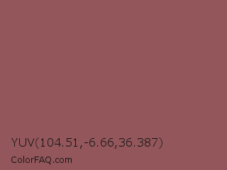 YUV 104.51,-6.66,36.387 Color is a normal red color and the nearest color is Rose Taupe #905d5d. Hex code #92565b and RGB value is rgb(146,86,91). In RGB color space, this color is composed of 57% red, 34% green, 36% blue, In CMYK color space, this color is composed of 0% cyan, 41% magenta, 38% yellow , 43% black , In HSL color space, this color has a hue angle of 355° , 26% saturation and 45% lightness.