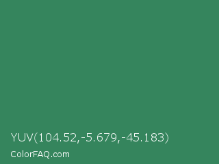YUV 104.52,-5.679,-45.183 Color is a normal green color and the nearest color is Sea Green #2e8b57. Hex code #35855d and RGB value is rgb(53,133,93). In RGB color space, this color is composed of 21% red, 52% green, 36% blue, In CMYK color space, this color is composed of 60% cyan, 0% magenta, 30% yellow , 48% black , In HSL color space, this color has a hue angle of 150° , 43% saturation and 36% lightness.