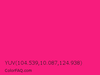 YUV 104.539,10.087,124.938 Color is a normal rose color and the nearest color is Fluorescent Pink #ff1493. Hex code #f71c7d and RGB value is rgb(247,28,125). In RGB color space, this color is composed of 97% red, 11% green, 49% blue, In CMYK color space, this color is composed of 0% cyan, 89% magenta, 49% yellow , 3% black , In HSL color space, this color has a hue angle of 333° , 93% saturation and 54% lightness.