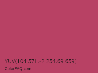 YUV 104.571,-2.254,69.659 Color is a normal rose color and the nearest color is Deep Blush #b44668. Hex code #b84164 and RGB value is rgb(184,65,100). In RGB color space, this color is composed of 72% red, 25% green, 39% blue, In CMYK color space, this color is composed of 0% cyan, 65% magenta, 46% yellow , 28% black , In HSL color space, this color has a hue angle of 342° , 48% saturation and 49% lightness.