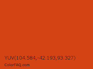 YUV 104.584,-42.193,93.327 Color is a normal color and the nearest color is Sinopia #cb410b. Hex code #d34313 and RGB value is rgb(211,67,19). In RGB color space, this color is composed of 83% red, 26% green, 7% blue, In CMYK color space, this color is composed of 0% cyan, 68% magenta, 91% yellow , 17% black , In HSL color space, this color has a hue angle of 15° , 83% saturation and 45% lightness.