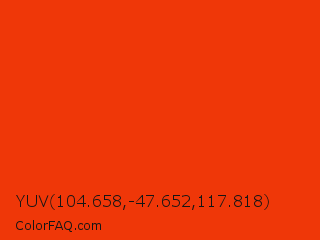 YUV 104.658,-47.652,117.818 Color is a normal red color and the nearest color is Coquelicot #ff3800. Hex code #ef3708 and RGB value is rgb(239,55,8). In RGB color space, this color is composed of 94% red, 22% green, 3% blue, In CMYK color space, this color is composed of 0% cyan, 77% magenta, 97% yellow , 6% black , In HSL color space, this color has a hue angle of 12° , 94% saturation and 48% lightness.