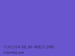 YUV 104.66,49.468,0.298 Color is a normal indigo color and the nearest color is Slate Blue #6a5acd. Hex code #6955cd and RGB value is rgb(105,85,205). In RGB color space, this color is composed of 41% red, 33% green, 80% blue, In CMYK color space, this color is composed of 49% cyan, 59% magenta, 0% yellow , 20% black , In HSL color space, this color has a hue angle of 250° , 55% saturation and 57% lightness.