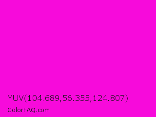 YUV 104.689,56.355,124.807 Color is a normal magenta color and the nearest color is Purple Pizzazz #ff00cc. Hex code #f70adb and RGB value is rgb(247,10,219). In RGB color space, this color is composed of 97% red, 4% green, 86% blue, In CMYK color space, this color is composed of 0% cyan, 96% magenta, 11% yellow , 3% black , In HSL color space, this color has a hue angle of 307° , 94% saturation and 50% lightness.