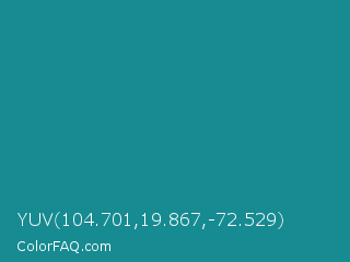 YUV 104.701,19.867,-72.529 Color is a normal cyan color and the nearest color is Blue Chill #0c8990. Hex code #168b91 and RGB value is rgb(22,139,145). In RGB color space, this color is composed of 9% red, 55% green, 57% blue, In CMYK color space, this color is composed of 85% cyan, 4% magenta, 0% yellow , 43% black , In HSL color space, this color has a hue angle of 183° , 74% saturation and 33% lightness.