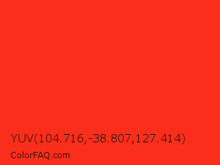 YUV 104.716,-38.807,127.414 Color is a normal red color and the nearest color is Red RYB #fe2712. Hex code #fa2e1a and RGB value is rgb(250,46,26). In RGB color space, this color is composed of 98% red, 18% green, 10% blue, In CMYK color space, this color is composed of 0% cyan, 82% magenta, 90% yellow , 2% black , In HSL color space, this color has a hue angle of 5° , 96% saturation and 54% lightness.