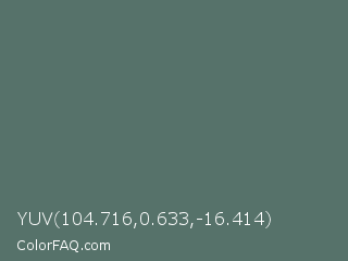 YUV 104.716,0.633,-16.414 Color is a normal green color and the nearest color is Cutty Sark #507672. Hex code #56726a and RGB value is rgb(86,114,106). In RGB color space, this color is composed of 34% red, 45% green, 42% blue, In CMYK color space, this color is composed of 25% cyan, 0% magenta, 7% yellow , 55% black , In HSL color space, this color has a hue angle of 163° , 14% saturation and 39% lightness.