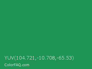 YUV 104.721,-10.708,-65.53 Color is a normal green color and the nearest color is Eucalyptus #278a5b. Hex code #1e9353 and RGB value is rgb(30,147,83). In RGB color space, this color is composed of 12% red, 58% green, 33% blue, In CMYK color space, this color is composed of 80% cyan, 0% magenta, 44% yellow , 42% black , In HSL color space, this color has a hue angle of 147° , 66% saturation and 35% lightness.