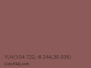 YUV 104.722,-8.244,30.939 Color is a normal red color and the nearest color is Rose Taupe #905d5d. Hex code #8c5a58 and RGB value is rgb(140,90,88). In RGB color space, this color is composed of 55% red, 35% green, 35% blue, In CMYK color space, this color is composed of 0% cyan, 36% magenta, 37% yellow , 45% black , In HSL color space, this color has a hue angle of 2° , 23% saturation and 45% lightness.