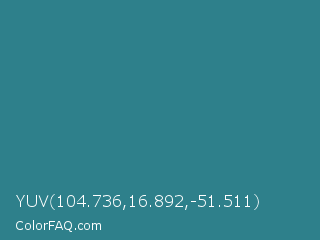 YUV 104.736,16.892,-51.511 Color is a normal cyan color and the nearest color is Paradiso #317d82. Hex code #2e808b and RGB value is rgb(46,128,139). In RGB color space, this color is composed of 18% red, 50% green, 55% blue, In CMYK color space, this color is composed of 67% cyan, 8% magenta, 0% yellow , 45% black , In HSL color space, this color has a hue angle of 187° , 50% saturation and 36% lightness.