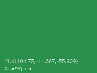 YUV 104.75,-14.667,-55.909 Color is a normal green color and the nearest color is Sea Green #2e8b57. Hex code #298f4b and RGB value is rgb(41,143,75). In RGB color space, this color is composed of 16% red, 56% green, 29% blue, In CMYK color space, this color is composed of 71% cyan, 0% magenta, 48% yellow , 44% black , In HSL color space, this color has a hue angle of 140° , 55% saturation and 36% lightness.