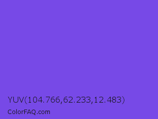 YUV 104.766,62.233,12.483 Color is a normal indigo color and the nearest color is Majorelle Blue #6050dc. Hex code #7749e7 and RGB value is rgb(119,73,231). In RGB color space, this color is composed of 47% red, 29% green, 91% blue, In CMYK color space, this color is composed of 48% cyan, 68% magenta, 0% yellow , 9% black , In HSL color space, this color has a hue angle of 257° , 77% saturation and 60% lightness.