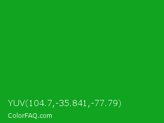 YUV 104.7,-35.841,-77.79 Color is a normal green color and the nearest color is North Texas Green #059033. Hex code #10a420 and RGB value is rgb(16,164,32). In RGB color space, this color is composed of 6% red, 64% green, 13% blue, In CMYK color space, this color is composed of 90% cyan, 0% magenta, 80% yellow , 36% black , In HSL color space, this color has a hue angle of 126° , 82% saturation and 35% lightness.
