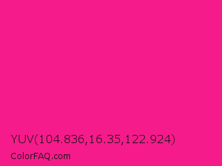 YUV 104.836,16.35,122.924 Color is a normal rose color and the nearest color is Fluorescent Pink #ff1493. Hex code #f51b8a and RGB value is rgb(245,27,138). In RGB color space, this color is composed of 96% red, 11% green, 54% blue, In CMYK color space, this color is composed of 0% cyan, 89% magenta, 44% yellow , 4% black , In HSL color space, this color has a hue angle of 329° , 92% saturation and 53% lightness.
