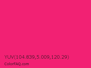 YUV 104.839,5.009,120.29 Color is a normal rose color and the nearest color is Razzmatazz #e3256b. Hex code #f22173 and RGB value is rgb(242,33,115). In RGB color space, this color is composed of 95% red, 13% green, 45% blue, In CMYK color space, this color is composed of 0% cyan, 86% magenta, 52% yellow , 5% black , In HSL color space, this color has a hue angle of 336° , 89% saturation and 54% lightness.