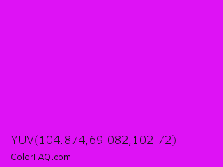 YUV 104.874,69.082,102.72 Color is a normal magenta color and the nearest color is Phlox #df00ff. Hex code #de12f5 and RGB value is rgb(222,18,245). In RGB color space, this color is composed of 87% red, 7% green, 96% blue, In CMYK color space, this color is composed of 9% cyan, 93% magenta, 0% yellow , 4% black , In HSL color space, this color has a hue angle of 294° , 92% saturation and 52% lightness.
