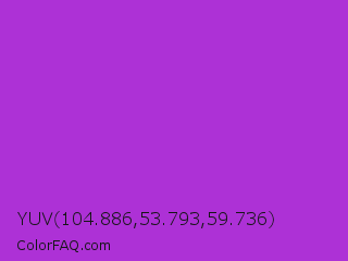 YUV 104.886,53.793,59.736 Color is a normal purple color and the nearest color is Dark Orchid #9932cc. Hex code #ad31d6 and RGB value is rgb(173,49,214). In RGB color space, this color is composed of 68% red, 19% green, 84% blue, In CMYK color space, this color is composed of 19% cyan, 77% magenta, 0% yellow , 16% black , In HSL color space, this color has a hue angle of 285° , 67% saturation and 52% lightness.