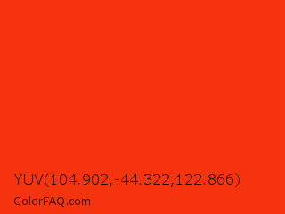 YUV 104.902,-44.322,122.866 Color is a normal red color and the nearest color is Red RYB #fe2712. Hex code #f5330f and RGB value is rgb(245,51,15). In RGB color space, this color is composed of 96% red, 20% green, 6% blue, In CMYK color space, this color is composed of 0% cyan, 79% magenta, 94% yellow , 4% black , In HSL color space, this color has a hue angle of 9° , 92% saturation and 51% lightness.