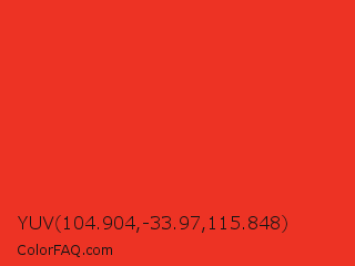 YUV 104.904,-33.97,115.848 Color is a normal red color and the nearest color is Permanent Geranium Lake #e12c2c. Hex code #ed3324 and RGB value is rgb(237,51,36). In RGB color space, this color is composed of 93% red, 20% green, 14% blue, In CMYK color space, this color is composed of 0% cyan, 78% magenta, 85% yellow , 7% black , In HSL color space, this color has a hue angle of 4° , 85% saturation and 54% lightness.