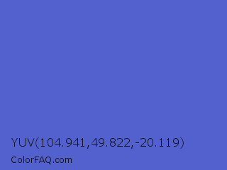YUV 104.941,49.822,-20.119 Color is a normal blue color and the nearest color is Indigo #4f69c6. Hex code #5261ce and RGB value is rgb(82,97,206). In RGB color space, this color is composed of 32% red, 38% green, 81% blue, In CMYK color space, this color is composed of 60% cyan, 53% magenta, 0% yellow , 19% black , In HSL color space, this color has a hue angle of 233° , 56% saturation and 56% lightness.