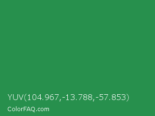 YUV 104.967,-13.788,-57.853 Color is a normal green color and the nearest color is Sea Green #2e8b57. Hex code #27904d and RGB value is rgb(39,144,77). In RGB color space, this color is composed of 15% red, 56% green, 30% blue, In CMYK color space, this color is composed of 73% cyan, 0% magenta, 47% yellow , 44% black , In HSL color space, this color has a hue angle of 142° , 57% saturation and 36% lightness.