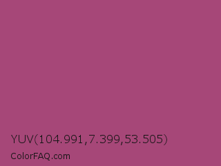 YUV 104.991,7.399,53.505 Color is a normal rose color and the nearest color is Magenta Haze #9f4576. Hex code #a64778 and RGB value is rgb(166,71,120). In RGB color space, this color is composed of 65% red, 28% green, 47% blue, In CMYK color space, this color is composed of 0% cyan, 57% magenta, 28% yellow , 35% black , In HSL color space, this color has a hue angle of 329° , 40% saturation and 46% lightness.