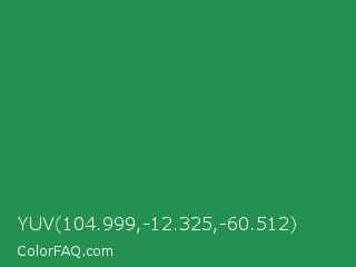YUV 104.999,-12.325,-60.512 Color is a normal green color and the nearest color is Eucalyptus #278a5b. Hex code #249150 and RGB value is rgb(36,145,80). In RGB color space, this color is composed of 14% red, 57% green, 31% blue, In CMYK color space, this color is composed of 75% cyan, 0% magenta, 45% yellow , 43% black , In HSL color space, this color has a hue angle of 144° , 60% saturation and 35% lightness.