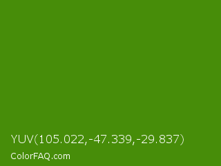 YUV 105.022,-47.339,-29.837 Color is a dark green color and the nearest color is Avocado #568203. Hex code #478d09 and RGB value is rgb(71,141,9). In RGB color space, this color is composed of 28% red, 55% green, 4% blue, In CMYK color space, this color is composed of 50% cyan, 0% magenta, 94% yellow , 45% black , In HSL color space, this color has a hue angle of 92° , 88% saturation and 29% lightness.