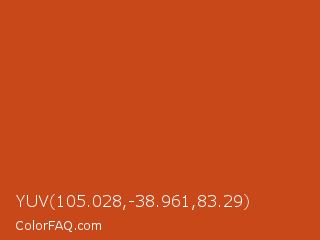 YUV 105.028,-38.961,83.29 Color is a normal orange color and the nearest color is Tia Maria #c1440e. Hex code #c8481a and RGB value is rgb(200,72,26). In RGB color space, this color is composed of 78% red, 28% green, 10% blue, In CMYK color space, this color is composed of 0% cyan, 64% magenta, 87% yellow , 22% black , In HSL color space, this color has a hue angle of 16° , 77% saturation and 44% lightness.