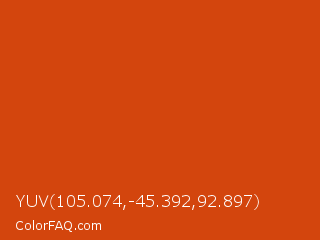 YUV 105.074,-45.392,92.897 Color is a normal orange color and the nearest color is Sinopia #cb410b. Hex code #d3450d and RGB value is rgb(211,69,13). In RGB color space, this color is composed of 83% red, 27% green, 5% blue, In CMYK color space, this color is composed of 0% cyan, 67% magenta, 94% yellow , 17% black , In HSL color space, this color has a hue angle of 17° , 88% saturation and 44% lightness.