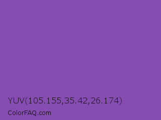 YUV 105.155,35.42,26.174 Color is a normal purple color and the nearest color is Royal Purple #7851a9. Hex code #874cb1 and RGB value is rgb(135,76,177). In RGB color space, this color is composed of 53% red, 30% green, 69% blue, In CMYK color space, this color is composed of 24% cyan, 57% magenta, 0% yellow , 31% black , In HSL color space, this color has a hue angle of 275° , 40% saturation and 50% lightness.