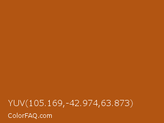 YUV 105.169,-42.974,63.873 Color is a normal orange color and the nearest color is Fiery Orange #b35213. Hex code #b25512 and RGB value is rgb(178,85,18). In RGB color space, this color is composed of 70% red, 33% green, 7% blue, In CMYK color space, this color is composed of 0% cyan, 52% magenta, 90% yellow , 30% black , In HSL color space, this color has a hue angle of 25° , 82% saturation and 38% lightness.