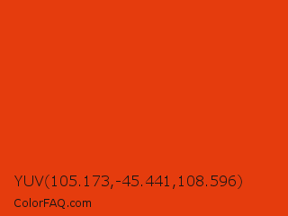 YUV 105.173,-45.441,108.596 Color is a normal red color and the nearest color is Trinidad #e64e03. Hex code #e53c0d and RGB value is rgb(229,60,13). In RGB color space, this color is composed of 90% red, 24% green, 5% blue, In CMYK color space, this color is composed of 0% cyan, 74% magenta, 94% yellow , 10% black , In HSL color space, this color has a hue angle of 13° , 89% saturation and 47% lightness.