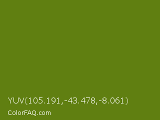 YUV 105.191,-43.478,-8.061 Color is a dark lime color and the nearest color is Avocado #568203. Hex code #607f11 and RGB value is rgb(96,127,17). In RGB color space, this color is composed of 38% red, 50% green, 7% blue, In CMYK color space, this color is composed of 24% cyan, 0% magenta, 87% yellow , 50% black , In HSL color space, this color has a hue angle of 77° , 76% saturation and 28% lightness.
