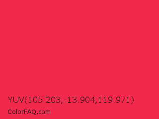YUV 105.203,-13.904,119.971 Color is a normal red color and the nearest color is Red Crayola #ee204d. Hex code #f2294d and RGB value is rgb(242,41,77). In RGB color space, this color is composed of 95% red, 16% green, 30% blue, In CMYK color space, this color is composed of 0% cyan, 83% magenta, 68% yellow , 5% black , In HSL color space, this color has a hue angle of 349° , 89% saturation and 55% lightness.