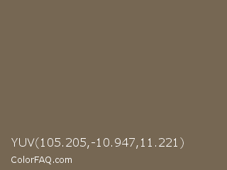 YUV 105.205,-10.947,11.221 Color is a normal orange color and the nearest color is Coffee #706555. Hex code #766753 and RGB value is rgb(118,103,83). In RGB color space, this color is composed of 46% red, 40% green, 33% blue, In CMYK color space, this color is composed of 0% cyan, 13% magenta, 30% yellow , 54% black , In HSL color space, this color has a hue angle of 34° , 17% saturation and 39% lightness.