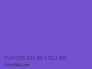 YUV 105.231,50.172,7.69 Color is a normal indigo color and the nearest color is Slate Blue #6a5acd. Hex code #7251cf and RGB value is rgb(114,81,207). In RGB color space, this color is composed of 45% red, 32% green, 81% blue, In CMYK color space, this color is composed of 45% cyan, 61% magenta, 0% yellow , 19% black , In HSL color space, this color has a hue angle of 256° , 57% saturation and 56% lightness.