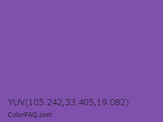 YUV 105.242,33.405,19.082 Color is a normal violet color and the nearest color is Royal Purple #7851a9. Hex code #7f51ad and RGB value is rgb(127,81,173). In RGB color space, this color is composed of 50% red, 32% green, 68% blue, In CMYK color space, this color is composed of 27% cyan, 53% magenta, 0% yellow , 32% black , In HSL color space, this color has a hue angle of 270° , 36% saturation and 50% lightness.