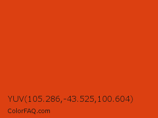 YUV 105.286,-43.525,100.604 Color is a normal red color and the nearest color is Vermilion #d9381e. Hex code #dc4011 and RGB value is rgb(220,64,17). In RGB color space, this color is composed of 86% red, 25% green, 7% blue, In CMYK color space, this color is composed of 0% cyan, 71% magenta, 92% yellow , 14% black , In HSL color space, this color has a hue angle of 14° , 86% saturation and 46% lightness.