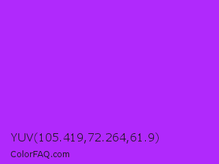 YUV 105.419,72.264,61.9 Color is a normal purple color and the nearest color is Veronica #a020f0. Hex code #b029fc and RGB value is rgb(176,41,252). In RGB color space, this color is composed of 69% red, 16% green, 99% blue, In CMYK color space, this color is composed of 30% cyan, 84% magenta, 0% yellow , 1% black , In HSL color space, this color has a hue angle of 278° , 97% saturation and 57% lightness.