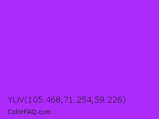 YUV 105.468,71.254,59.226 Color is a normal purple color and the nearest color is Veronica #a020f0. Hex code #ad2bfa and RGB value is rgb(173,43,250). In RGB color space, this color is composed of 68% red, 17% green, 98% blue, In CMYK color space, this color is composed of 31% cyan, 83% magenta, 0% yellow , 2% black , In HSL color space, this color has a hue angle of 278° , 95% saturation and 57% lightness.