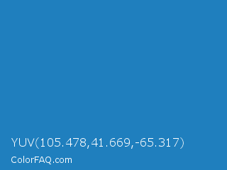 YUV 105.478,41.669,-65.317 Color is a normal blue color and the nearest color is Cyan Cornflower Blue #188bc2. Hex code #1f7fbe and RGB value is rgb(31,127,190). In RGB color space, this color is composed of 12% red, 50% green, 75% blue, In CMYK color space, this color is composed of 84% cyan, 33% magenta, 0% yellow , 25% black , In HSL color space, this color has a hue angle of 204° , 72% saturation and 43% lightness.