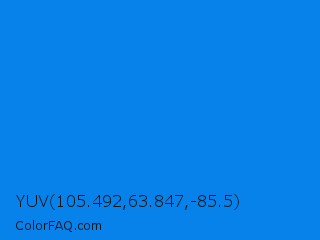 YUV 105.492,63.847,-85.5 Color is a normal blue color and the nearest color is Azure Radiance #007fff. Hex code #0882eb and RGB value is rgb(8,130,235). In RGB color space, this color is composed of 3% red, 51% green, 92% blue, In CMYK color space, this color is composed of 97% cyan, 45% magenta, 0% yellow , 8% black , In HSL color space, this color has a hue angle of 208° , 93% saturation and 48% lightness.