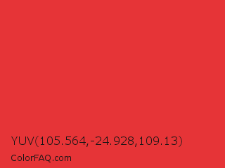 YUV 105.564,-24.928,109.13 Color is a normal red color and the nearest color is Deep Carmine Pink #ef3038. Hex code #e63437 and RGB value is rgb(230,52,55). In RGB color space, this color is composed of 90% red, 20% green, 22% blue, In CMYK color space, this color is composed of 0% cyan, 77% magenta, 76% yellow , 10% black , In HSL color space, this color has a hue angle of 359° , 78% saturation and 55% lightness.