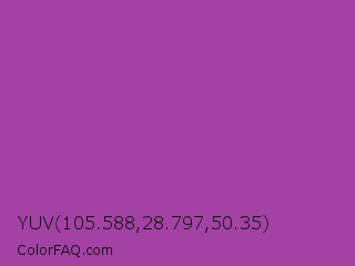 YUV 105.588,28.797,50.35 Color is a normal magenta color and the nearest color is Purpureus #9a4eae. Hex code #a341a4 and RGB value is rgb(163,65,164). In RGB color space, this color is composed of 64% red, 25% green, 64% blue, In CMYK color space, this color is composed of 1% cyan, 60% magenta, 0% yellow , 36% black , In HSL color space, this color has a hue angle of 299° , 43% saturation and 45% lightness.