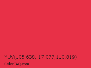 YUV 105.638,-17.077,110.819 Color is a normal red color and the nearest color is Amaranth #e52b50. Hex code #e83047 and RGB value is rgb(232,48,71). In RGB color space, this color is composed of 91% red, 19% green, 28% blue, In CMYK color space, this color is composed of 0% cyan, 79% magenta, 69% yellow , 9% black , In HSL color space, this color has a hue angle of 353° , 80% saturation and 55% lightness.