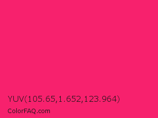 YUV 105.65,1.652,123.964 Color is a normal rose color and the nearest color is Razzmatazz #e3256b. Hex code #f7216d and RGB value is rgb(247,33,109). In RGB color space, this color is composed of 97% red, 13% green, 43% blue, In CMYK color space, this color is composed of 0% cyan, 87% magenta, 56% yellow , 3% black , In HSL color space, this color has a hue angle of 339° , 93% saturation and 55% lightness.