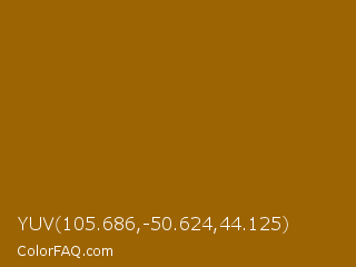 YUV 105.686,-50.624,44.125 Color is a normal orange color and the nearest color is Gamboge Orange Brown #996600. Hex code #9c6403 and RGB value is rgb(156,100,3). In RGB color space, this color is composed of 61% red, 39% green, 1% blue, In CMYK color space, this color is composed of 0% cyan, 36% magenta, 98% yellow , 39% black , In HSL color space, this color has a hue angle of 38° , 96% saturation and 31% lightness.