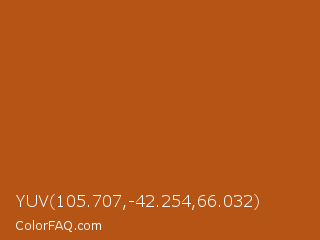 YUV 105.707,-42.254,66.032 Color is a normal orange color and the nearest color is Fiery Orange #b35213. Hex code #b55414 and RGB value is rgb(181,84,20). In RGB color space, this color is composed of 71% red, 33% green, 8% blue, In CMYK color space, this color is composed of 0% cyan, 54% magenta, 89% yellow , 29% black , In HSL color space, this color has a hue angle of 24° , 80% saturation and 39% lightness.