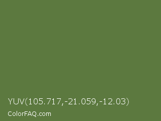 YUV 105.717,-21.059,-12.03 Color is a normal green color and the nearest color is Dingley #5d7747. Hex code #5c793f and RGB value is rgb(92,121,63). In RGB color space, this color is composed of 36% red, 47% green, 25% blue, In CMYK color space, this color is composed of 24% cyan, 0% magenta, 48% yellow , 53% black , In HSL color space, this color has a hue angle of 90° , 32% saturation and 36% lightness.